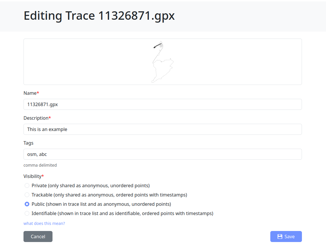 You will quickly notice the super-fast upload speed and the new trace animations. If thereās something wrong with the file you attached, you will receive instant feedback on the upload page. One new feature is possibility to edit trace name. Previously, this feature has been hidden behind API 0.6.